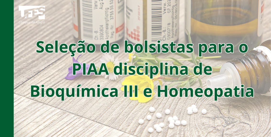 O Departamento de Farmácia e Nutrição do Centro de Ciências Exatas, Naturais e da Saúde, no uso de suas atribuições, considerando o disposto no Edital Prograd nº 22/2025 – Programa Institucional de Apoio Acadêmico (PIAA), torna público o Edital de seleção de bolsistas para o PIAA “(Monitoria e acompanhamento dos alunos matriculados na disciplina de Bioquímica III e Homeopatia do Campus de Alegre da UFES)” sob a coordenação da Professora Greiciane Gaburro Paneto da Universidade Federal do Espírito Santo, Campus de Alegre.